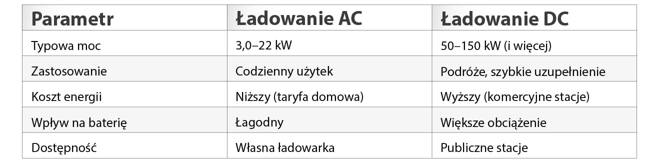 Porównanie ładowania AC (dom, praca) i DC (trasa, szybkie uzupełnianie energii) pokazuje wyraźne różnice w zastosowaniu i kosztach.