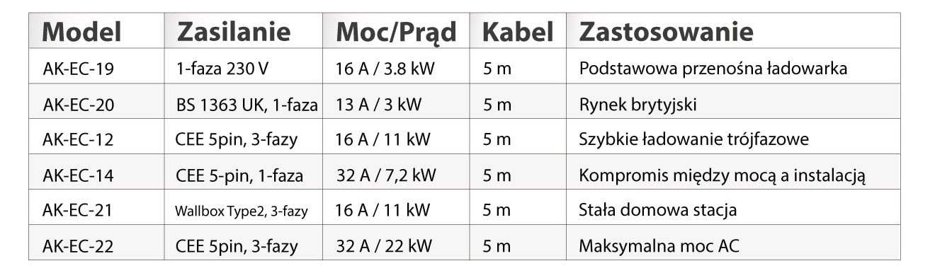 Konkretne modele w ofercie to m.in. AK-EC-18 (Type1, 3,8 kW), AK-EC-19 (Type2, 3,8 kW), AK-EC-21 Wallbox (Type2, 11 kW), AK-EC-22 (Type2, 22 kW) oraz AK-EC-24 (GB/T, 22 kW).