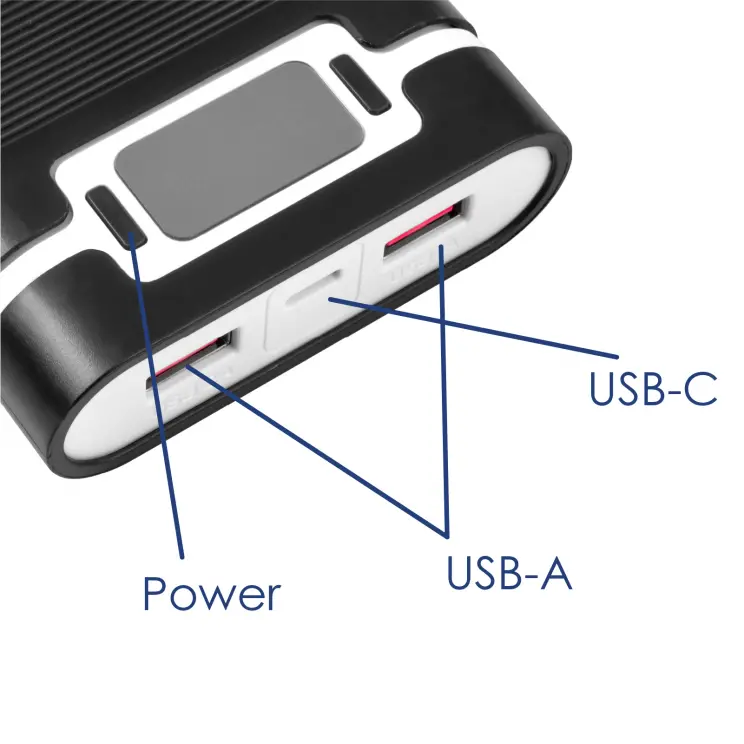 Obudowę powerbank AK-BC-03 wyposażono w trzy porty zasilania – dwa USB-A w technologii QC oraz jeden USB-C z funkcją PD – które umożliwiają szybkie i bezpieczne ładowanie urządzeń. Maksymalna moc wyjściowa 22,5 W pozwala na efektywne zasilanie smartfonów, tabletów i urządzeń ubieralnych, a obsługa napięć 5 V/3 A, 9 V/2 A oraz 12 V/1.5 A gwarantuje optymalną wydajność.